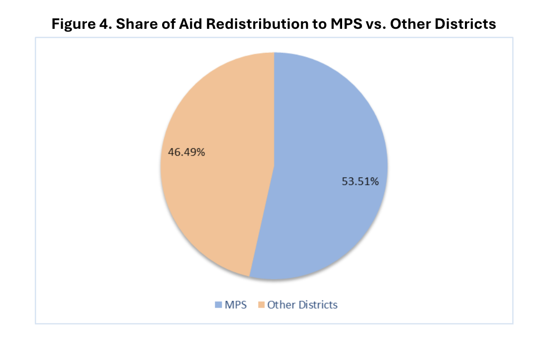 Figure 4 below depicts the share of the total aid shift that went to MPS versus other sources. In total according to DPI General Aid worksheets, about $182 million was redistributed away from school districts between 2024 and 2025. At the same time, MPS saw a staggering $97 million increase. This represents 53.51% of the total positive cost shift. And it’s not as if MPS is a growing district: the district lost 1,265 students in the membership count between 2024 and 2025.