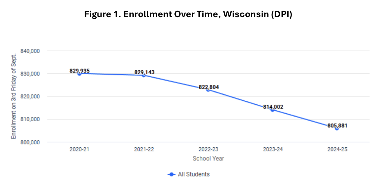 Wisconsin is a state that faces declining K-12 enrollment. Since the 2020 school year, enrollment across the state has declined by more than 25,000 students, or about 2.9%.