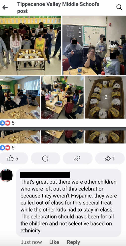 What Happened: On January 16, 2025, a teacher with the Tippecanoe Valley Middle School restricted students who were not Hispanic from enjoying the privilege of participating in a party celebrating Día de Los Reyes Magos, or Three Kings Day. Students who were not Hispanic were not invited or included in this party and remained in a “study hall,” preventing them from taking part in the celebration. The school commended this segregated party in a Facebook post.
